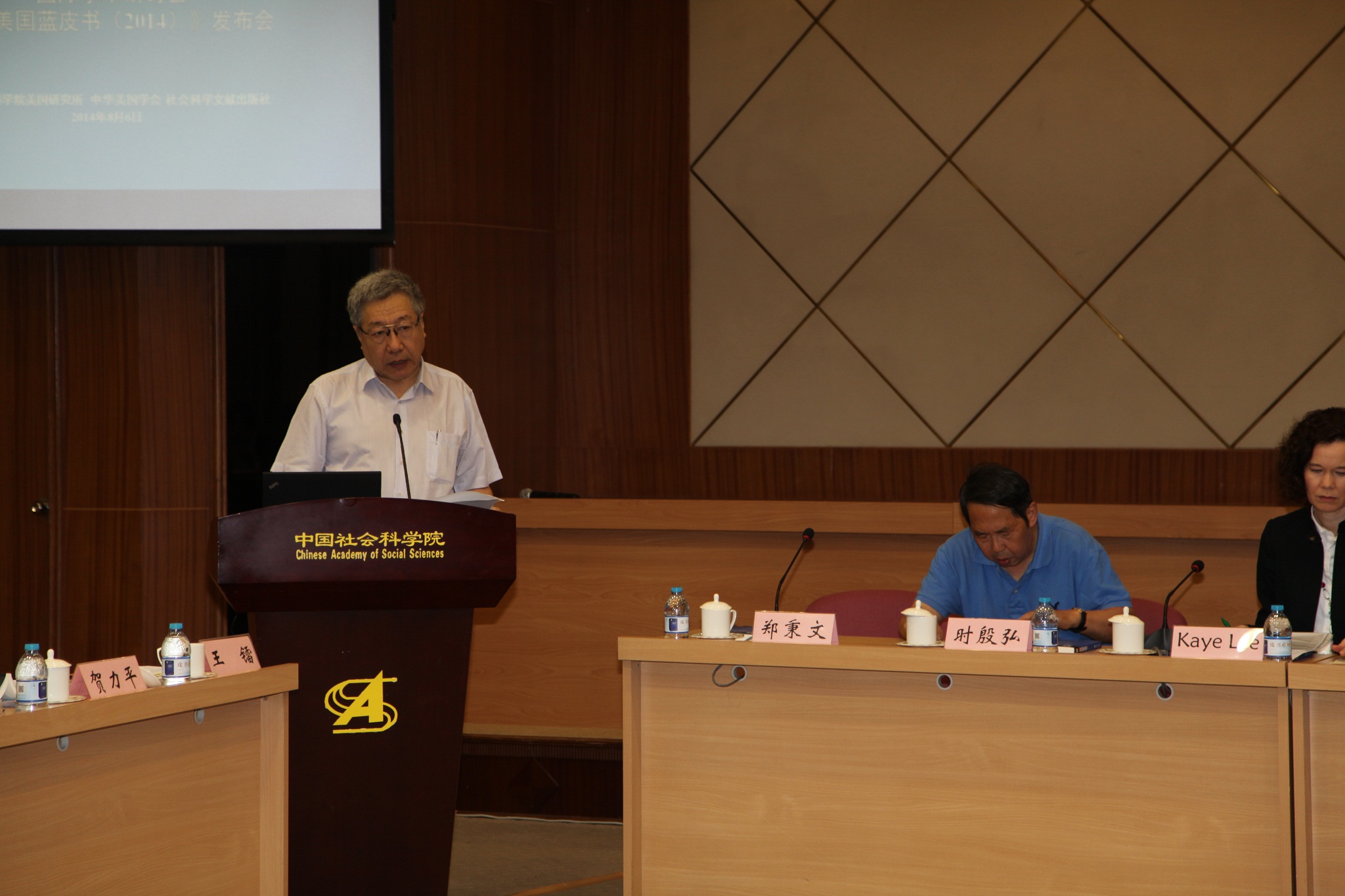 2014年8月6日,由中国社会科学院美国研究所、中华美国学会、社会科学文献出版社共同主办的“当前美国内政外交政策走向与中美关系前景”国际学术研讨会暨《美国蓝皮书2014》发布会在京举行。中国社会科学院副院长李扬研究员、全国人大外事工作委员会主任委员傅莹分别作主旨发言。美国驻华大使馆公使代办Kaye Lee女士致辞。来自中国现代国际关系研究院、中国国际问题研究院、清华大学、中国人民大学、北京师范大学、中国社会科学院以及社科文献出版社等单位的多位专家学者应邀与会发言。在学术研讨会上,与会专家学者就“美国政治经济形势”、“美国外交政策走向”、“中美关系现状与展望”等议题展开研讨。会议由社科院美国所所长郑秉文研究员主持,全所科研人员50余人参会。