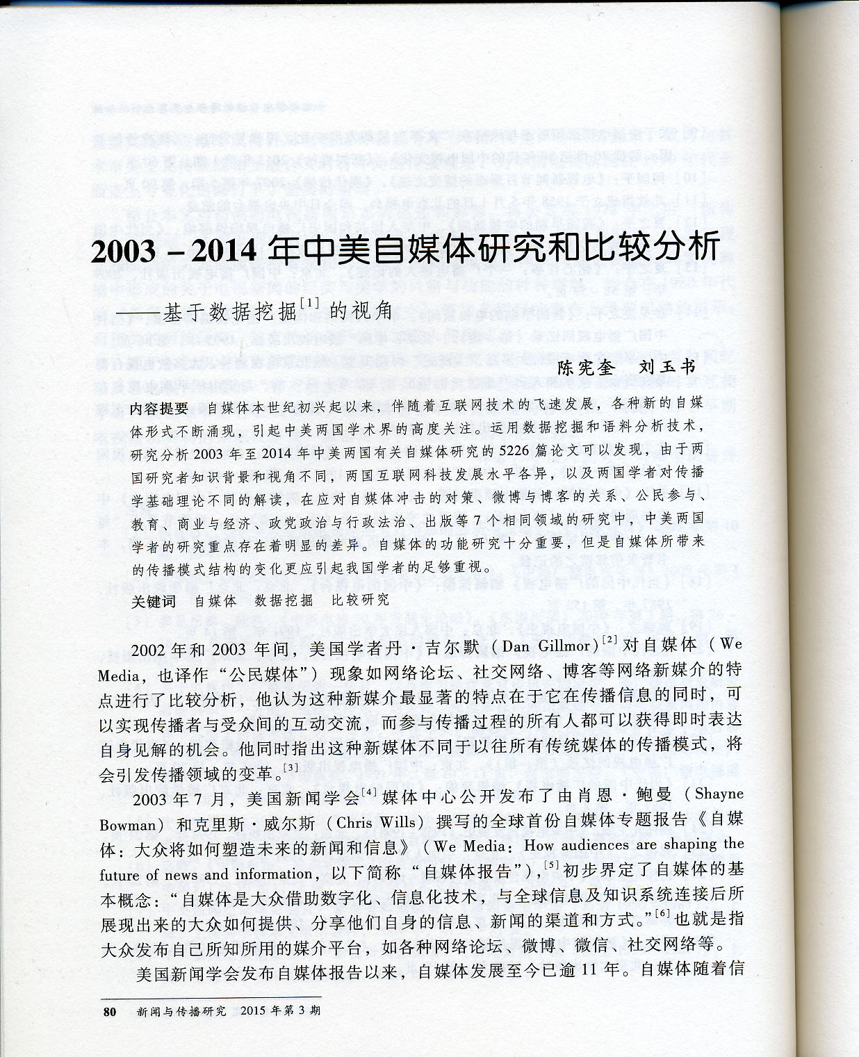 2003年是美国新媒体蓬勃发展的时期,自媒体的异军突起,更是引起了业界的广泛关注。正如时任美国媒体中心副主任戴尔· 佩斯金(Dale Peskin)在解释为什么要委托肖恩·鲍曼和克里斯· 威尔斯撰写首份自媒体研究报告时所说:“纵观历史,新闻和信息的获取渠道都是一种根据掌权当局的权力体制或者财富支配体系分配的特权。在过去的两个世纪中,独立媒体(美国)作为社会及其自身权利的倡导者,在民主启蒙时代扮演了核心的角色。然而,似乎现在有一个全新的时代强加给了我们——我们比以前任何时代都知道的要多,但在生硬的现实、困惑与矛盾之上,我们的知识在创造着焦虑。在新的时代,“讲故事的人(新闻工作者)”到底扮演着什么角色?当今信息灵通、相互连接的社会怎样再塑造新闻业?当新闻和信息变成可以相互分享的个人体验的一部分时,这个世界会变成什么样子?”[8]首份自媒体报告所提出的各种问题,引起了全球传播学领域的关注,国内学者也在稍后2年陆续开始研究相关问题。